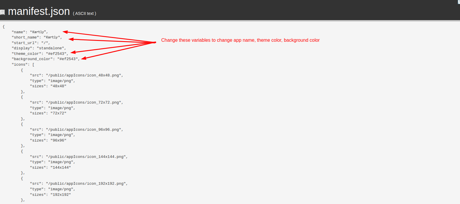3. if you want to change the theme color, background color & app_name, go to the "manifest.json" file in the root directory and there change "theme_color", "background_color", "name" & "short_name".