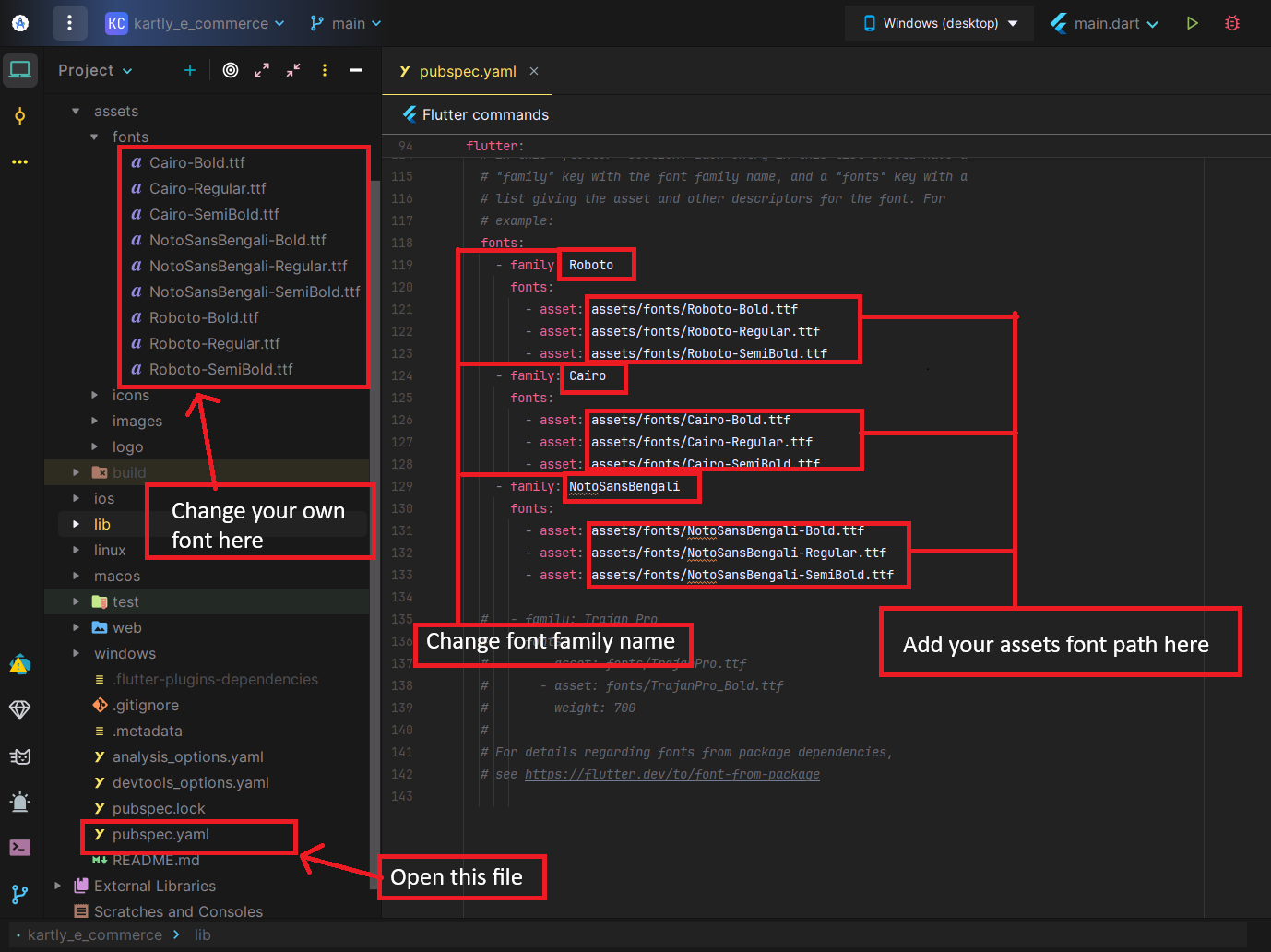 Open pubspec.yaml file, then change font family name & add your font assets path