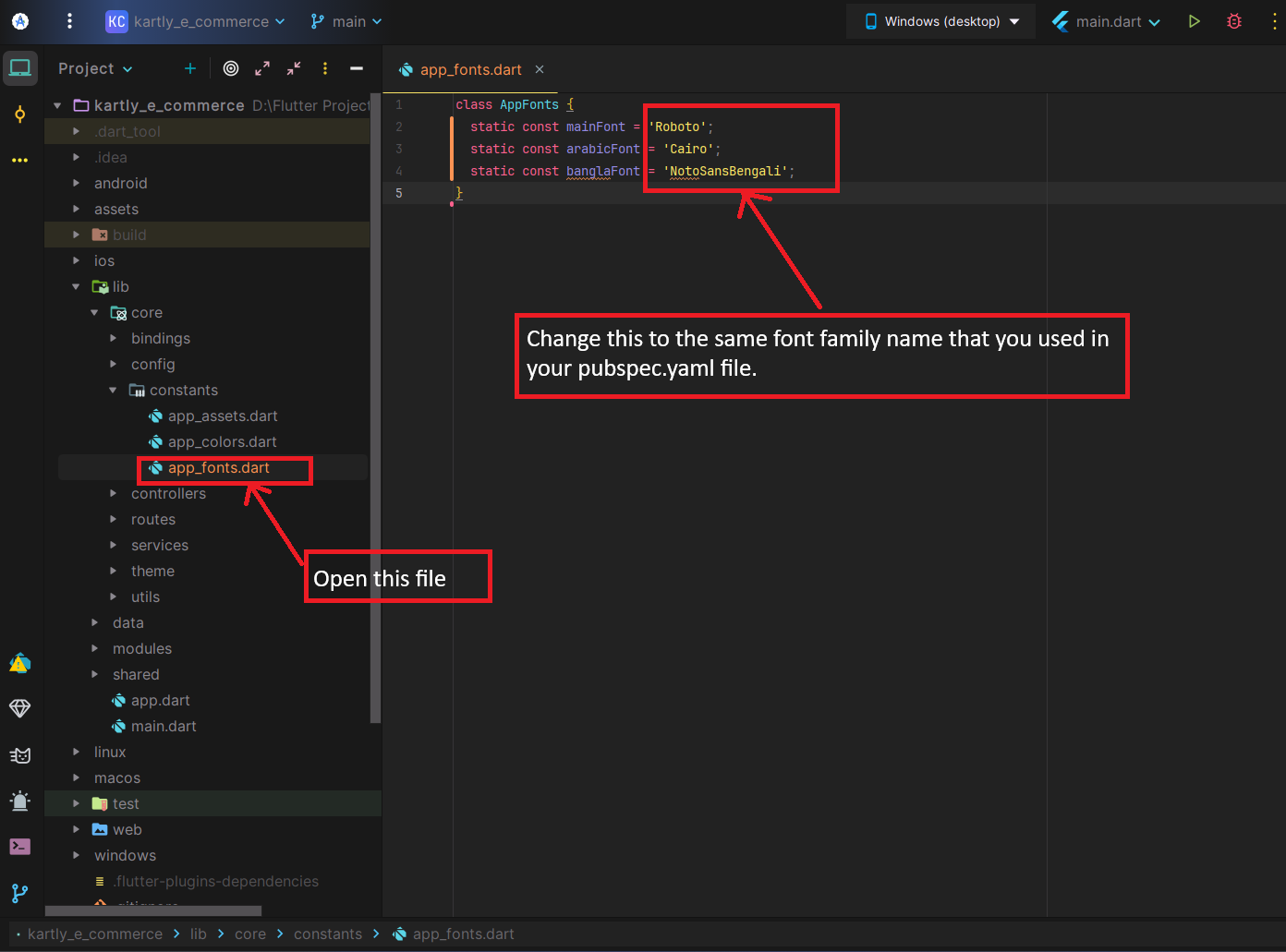 - Now open the <project>/lib/core/constants/app_fonts.dart file. Change the same font family name that you used in your pubspec.yaml file.