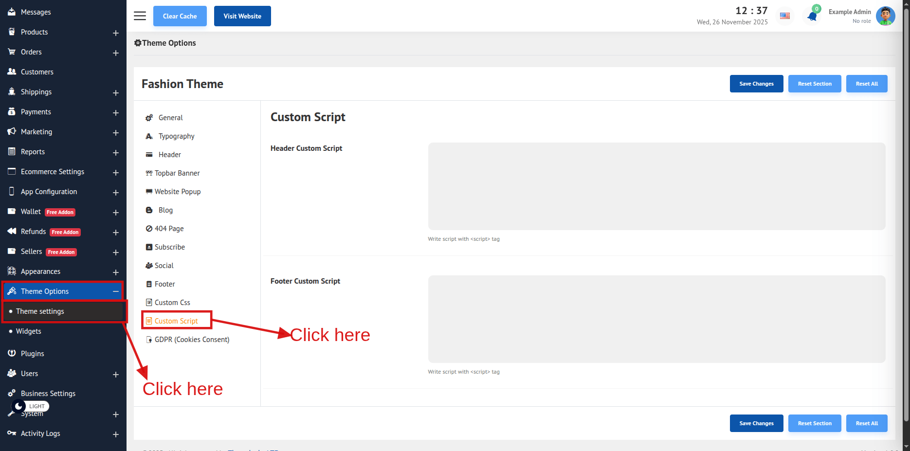 Header Custom Script - Write all the script you want to put on header. And write the theme on <script> tag.