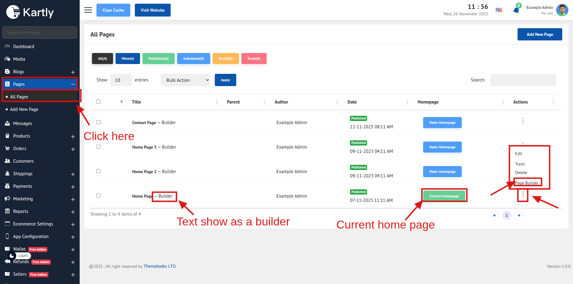 In the page list, you can see an option appeared, Make Homepage. You can now make any page Home Page, If it's made with Builder then the content will come from Builder, or if not then the page content will be the home page content.