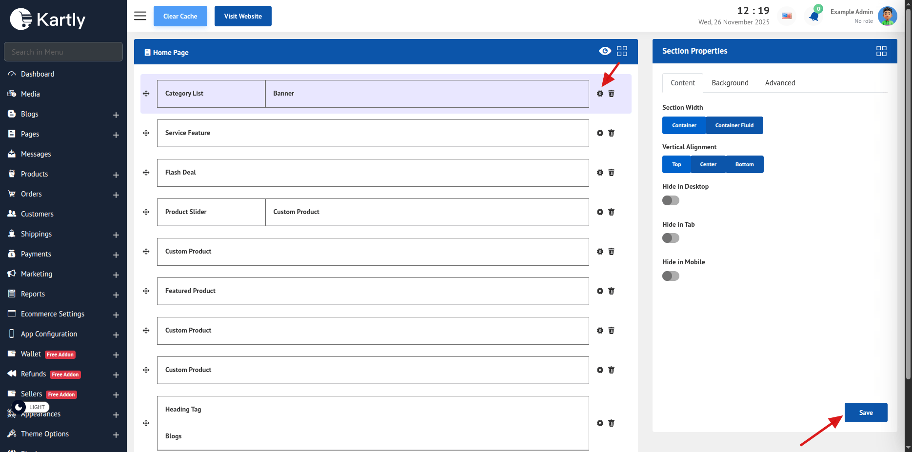 On the right, you can see the section settings properties. In the Content Tab, you can select if the section should be in a container or container fluid. Then The Section content Vertical Alignment.