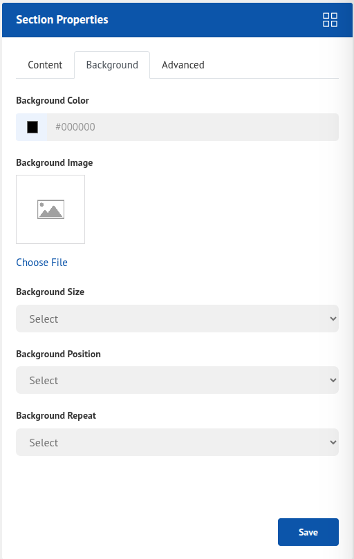 If you click on the widget settings icon. All the Widget Setting Properties will appear on the left side. Remember different widgets will have different content and style, but all widgets will have the Background and Advance option.