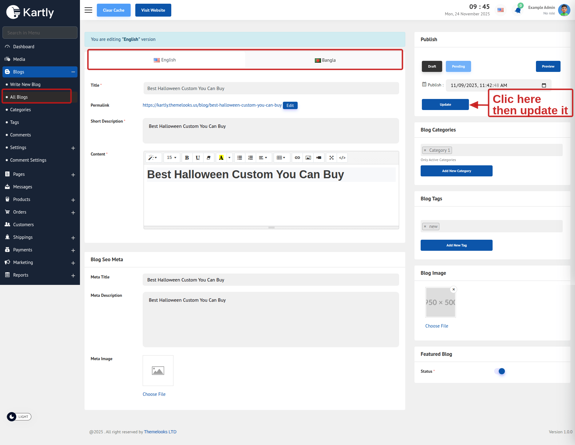 Follow Blogs > All Blogs to see the blog list page. Here you can filter blogs, manage status, edit blogs, delete blogs, and also can create blogs.