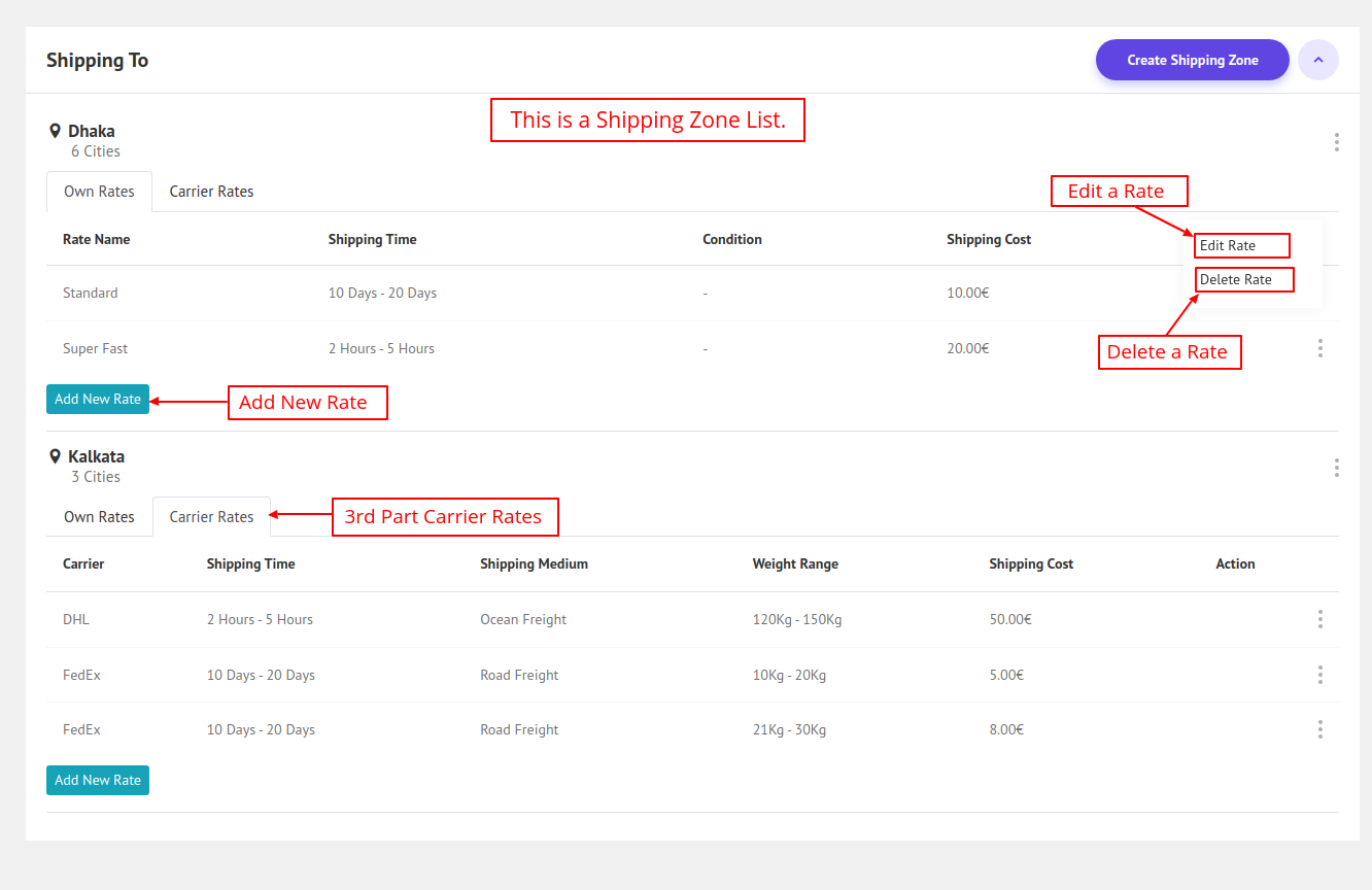 From the shipping zone list, you can create multiple shipping rates for each shipping zone. There are two types of shipping rates. One is its own rate and another is 3rd party carriers' rate. To create 3rd party carrier shipping rate you will need to activate 3rd party Carriers Plugin. When customers purchase products they will get these shipping rate options and they can choose one for each item in the cart to complete creating an order. From the shipping zone table, you will get an Add New Rate button to create a new shipping rate for each shipping zone.