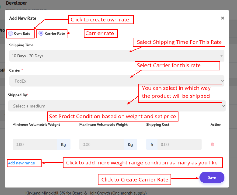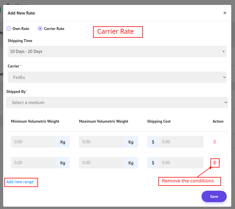 You can also add weight range and set price by clicking Add new Range as many you like and can also remove the range.