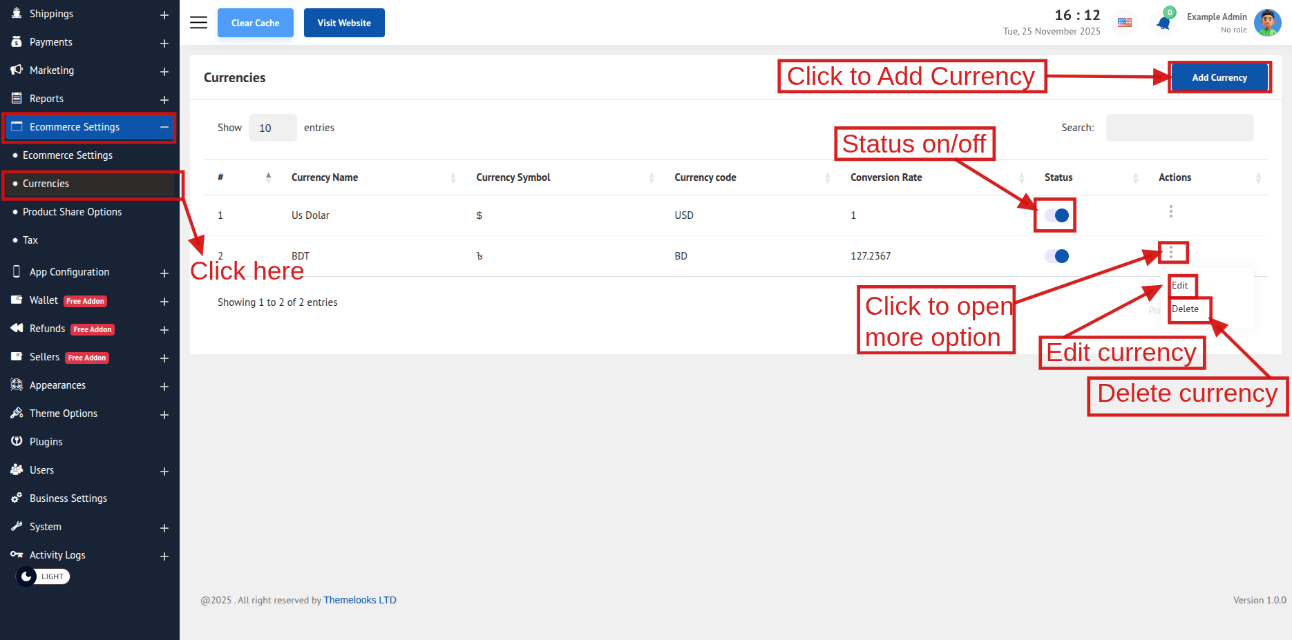 Now to edit or delete a currency click the three dots (.) from the actions column you will get the edit and delete link.