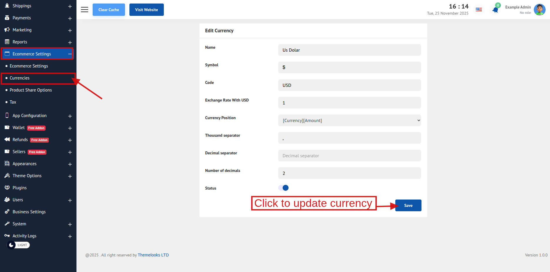 Currency is one of the most important parts of our e-commerce system. You can create as many currencies as you want and can manage them by status on/off.