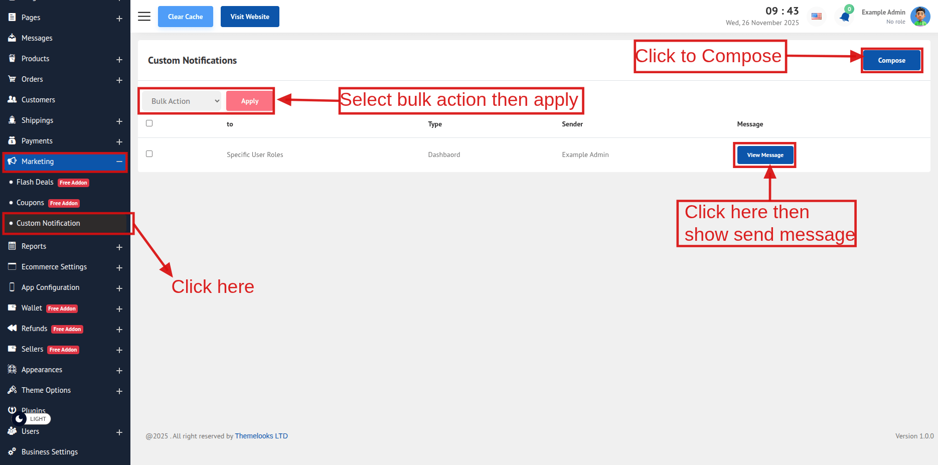 In this post, we will learn how to manage Custom Notifications. Follow Marketing > Custom notification and you will be redirected to the custom notification page. Where you can find all the notifications sent manually.