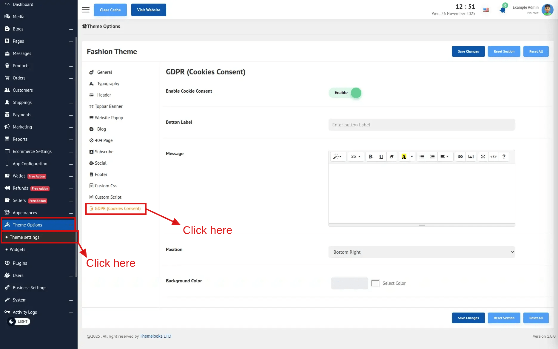 To manage GDRP Cookie Consent Follow Theme Options > General Settings. Click GDRP(Cookies Consent).