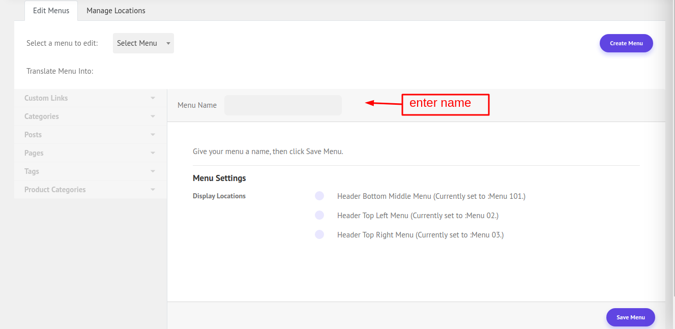- Here on this page, you can create a new menu by clicking Create Menu. Then an interface like the below image will appear and you can set the menu name, select the menu location if you want, and click save menu.