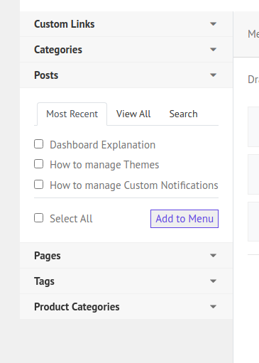 - Select items from the left sidebar and add them to the menu. You can create custom links and add them to the menu. You can also select Blog Categories, Blogs/Posts, Pages, Tags, Blog tags, and Product Categories. You can find them by most recent, view all, and also can search them. Then select one by one or select all then click add to the menu to add them to the selected menu.