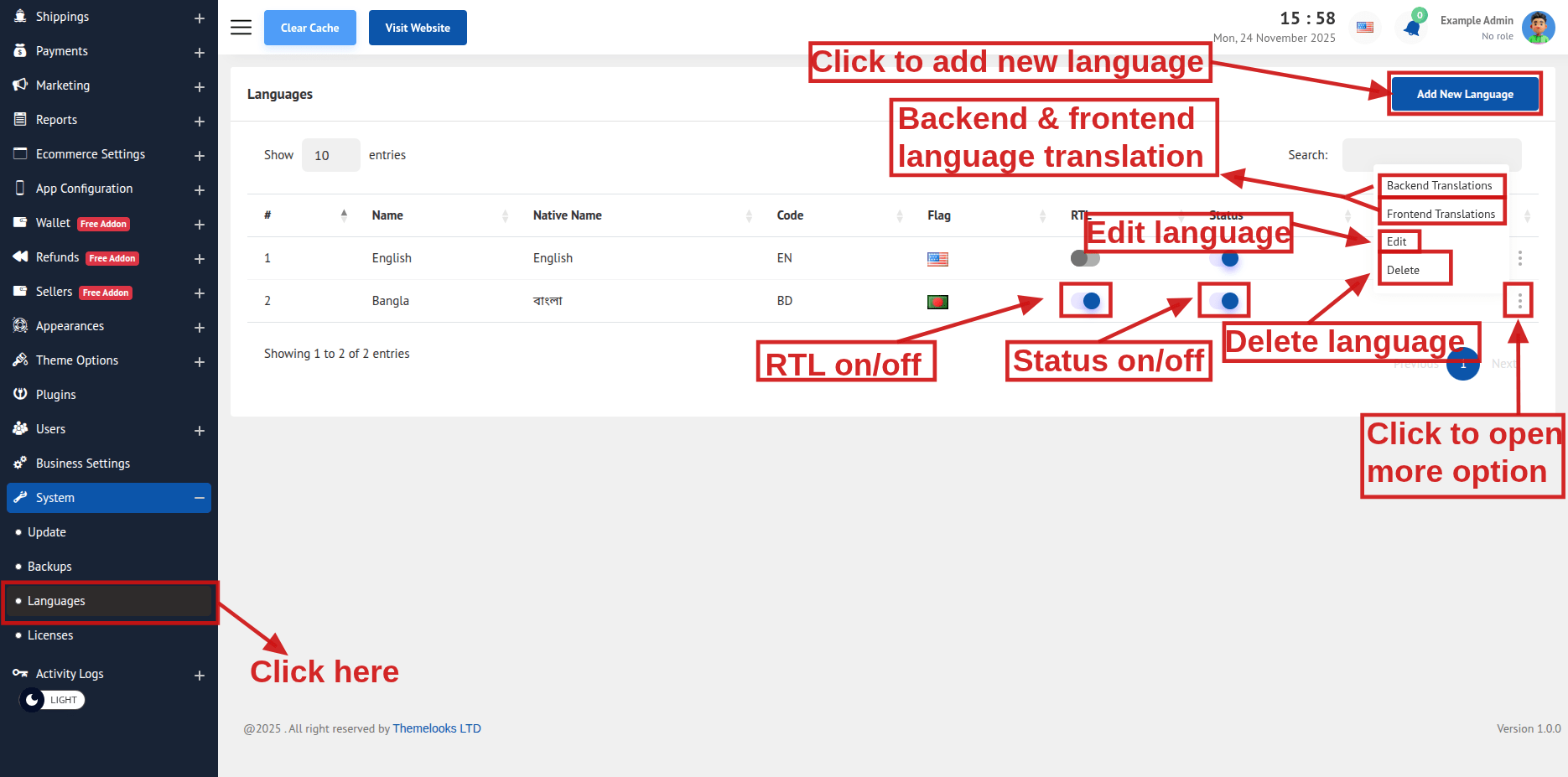 To Edit a Language Click The Edit from the language list Action options. It will redirect you to edit page.