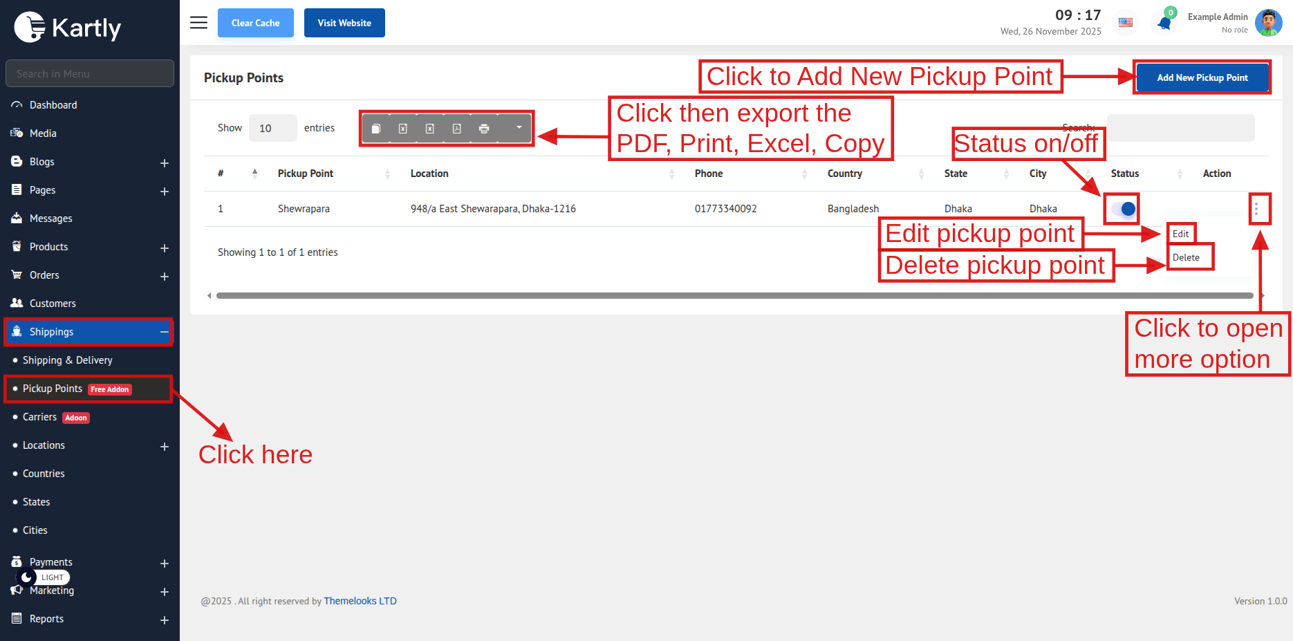 You can also edit a pickup point by clicking Edit from the list and you will be redirected to the edit page. And also can delete a pickup point by clicking the Delete link.