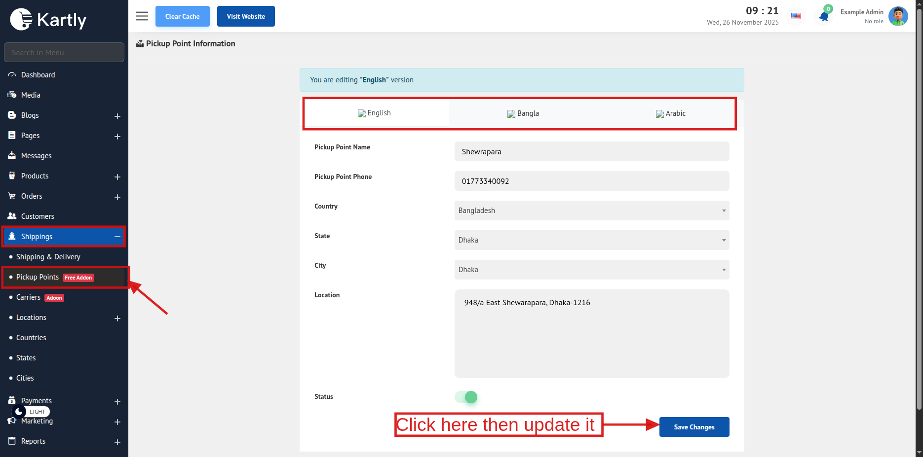 Here you can create a new pickup point. You can set the Pickup point name, Pickup point phone, Country, State, City, Location, and status.
