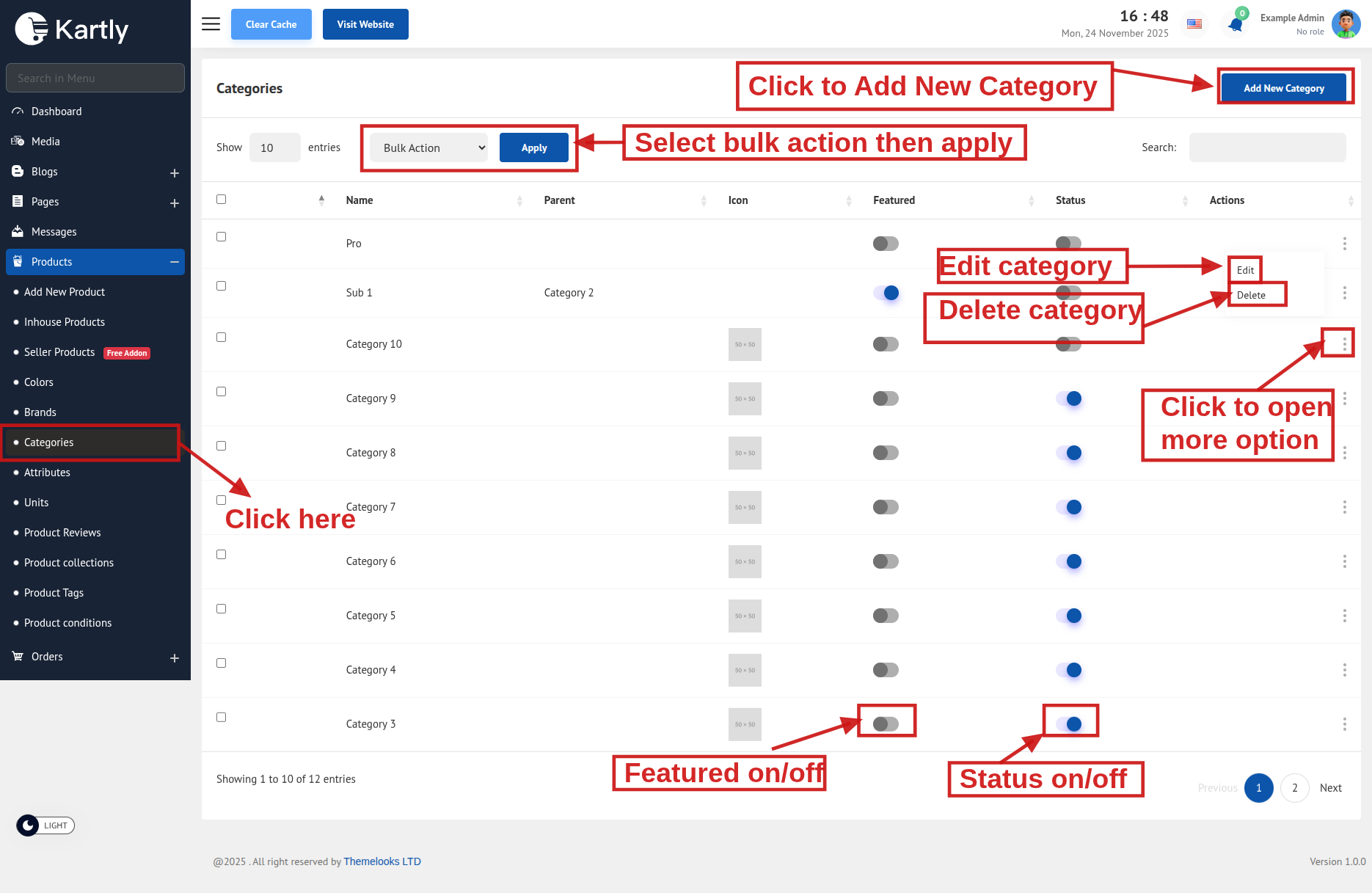 If you want to Edit a category click the Edit link from the list page action column three dot. It will redirect you to another page. You can also delete a category by clicking Delete Link.