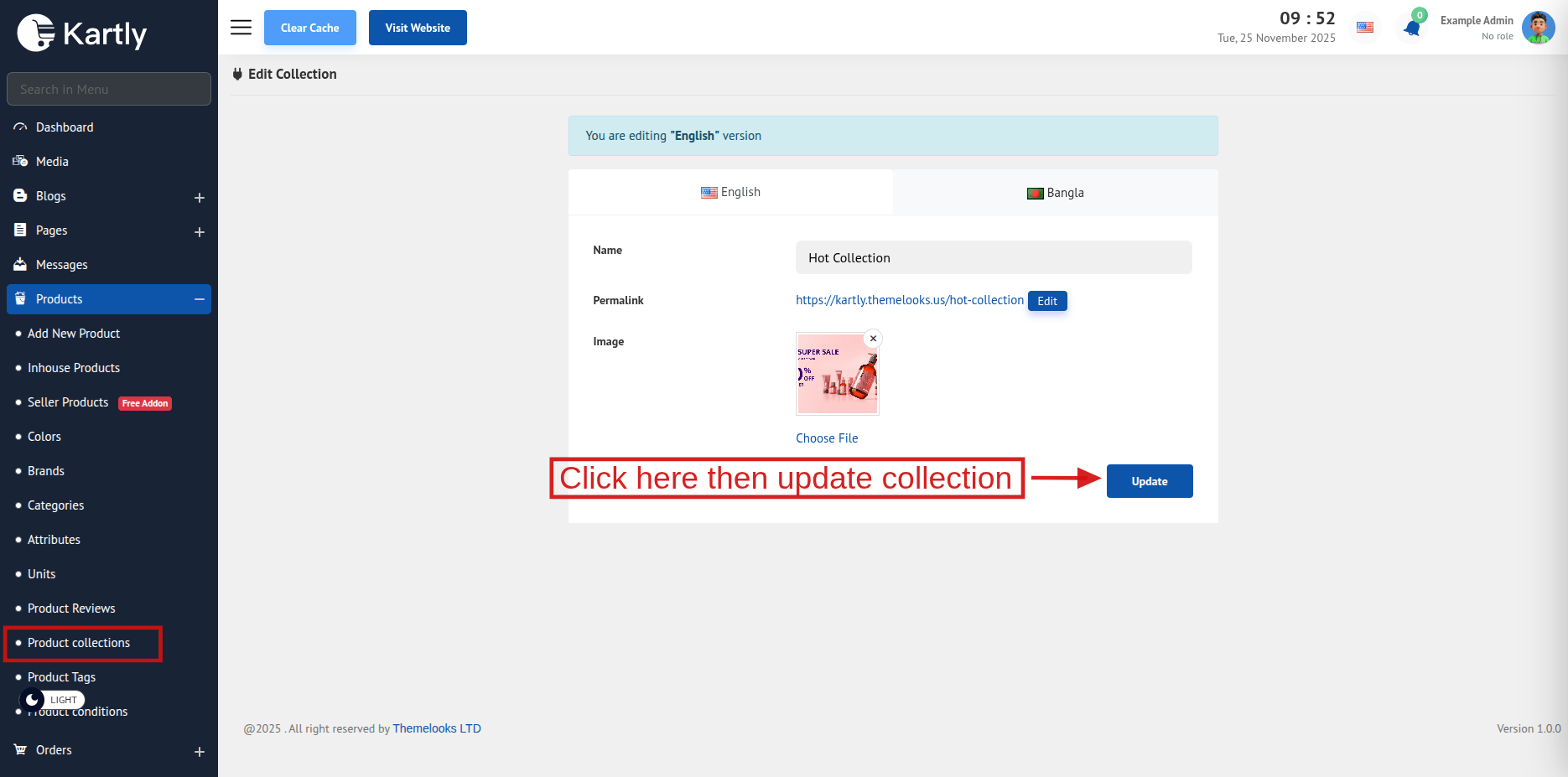 If you want to edit collection click Edit from collection list.It will redirect you to edit page. You can also delete a category by clicking Delete Link.