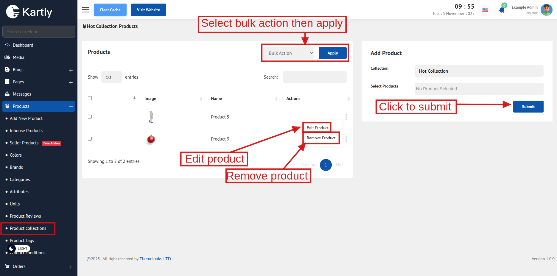After Creating a new product collection then click Manage Products then you will be redirected to a collection product list. Where you can choose which product will be on this collection.Also you can add or view products on a collection from collection list .There if you click on products column. Also you can remove collection then click Remove Products then it remove.