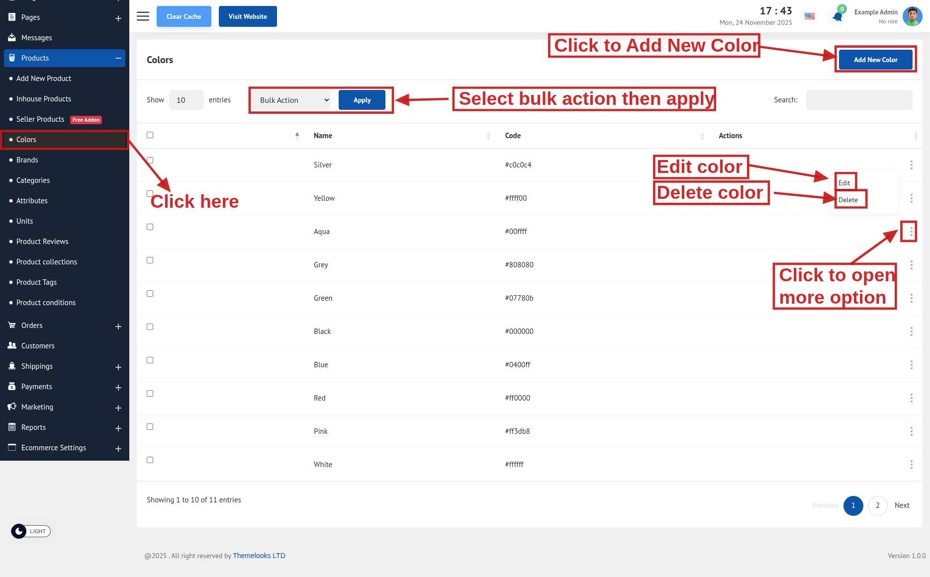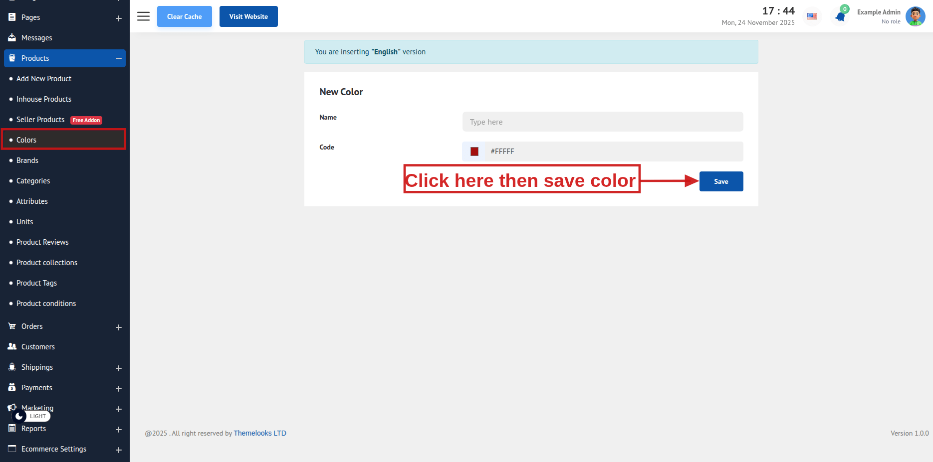 If you want to create a new product color click on Add New Color on the top. It will redirect you to add new tag page.