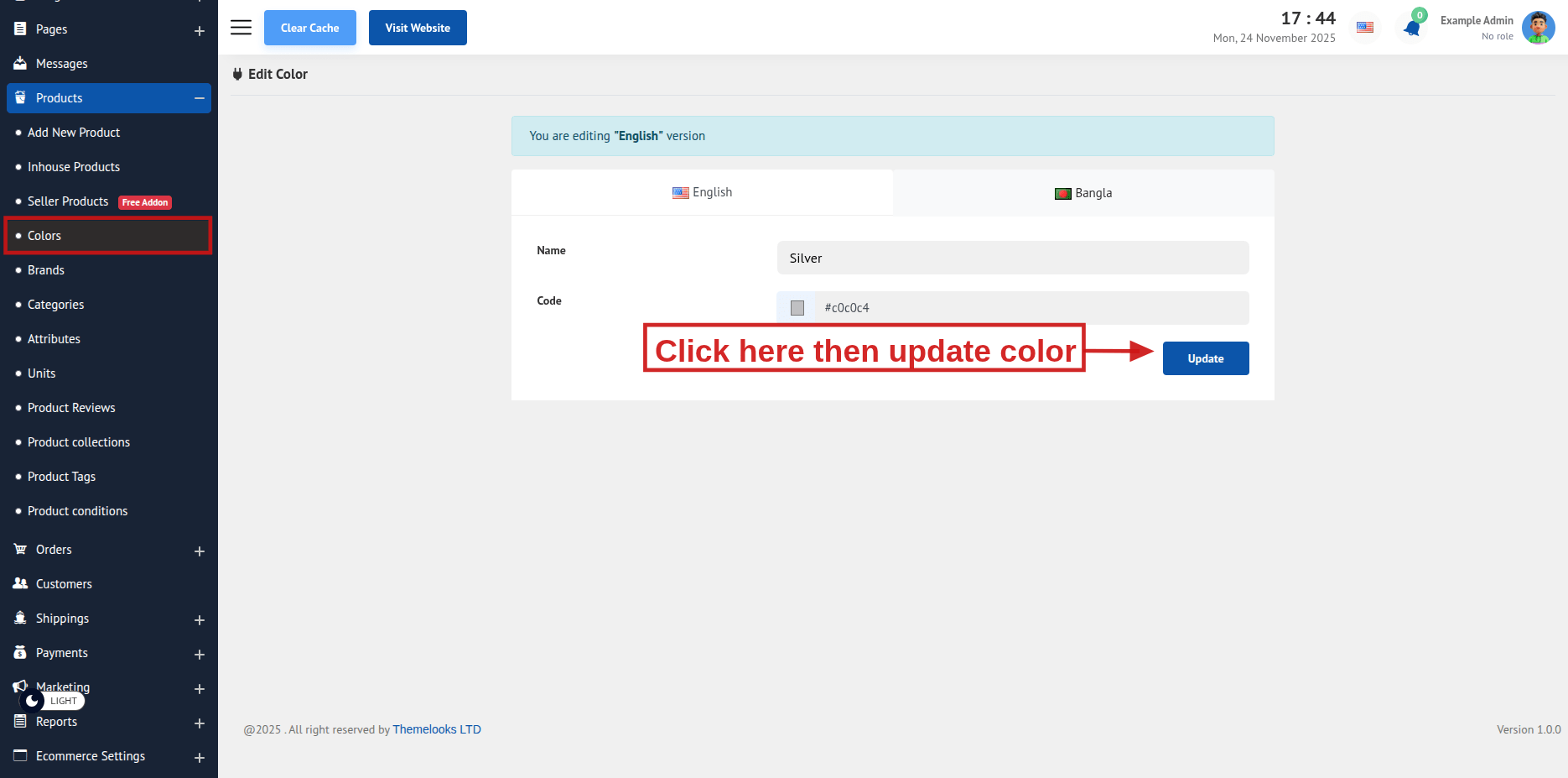 If you want to update a color click Edit from color list page and it will redirect you to edit page. You can also delete a category by clicking Delete Link.