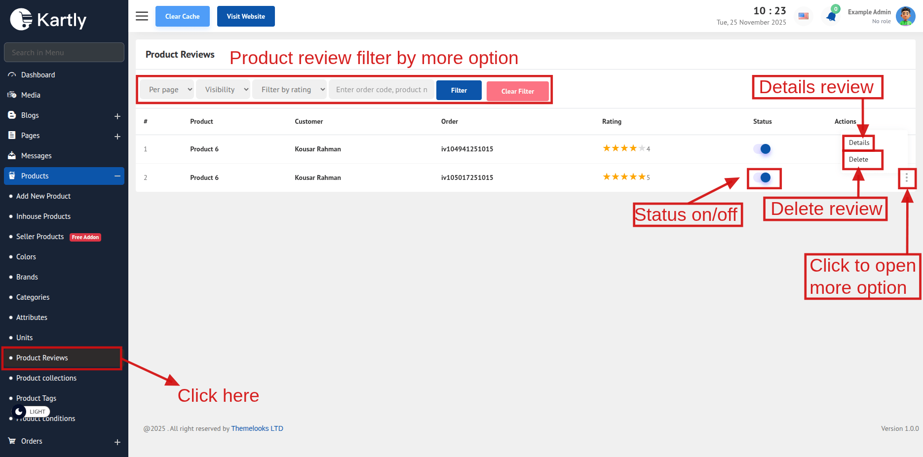 You can see review details then click Details button then show it. You can also remove the review then click Delete it remove.