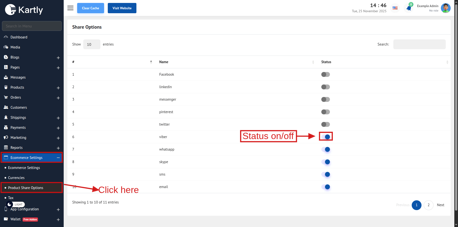 A Customer can share the product link in many media. Here on this page, all the options are available and you can select which options to show. You can turn off the status to hide any option. Go to E-commerce Settings > Product Share Options.