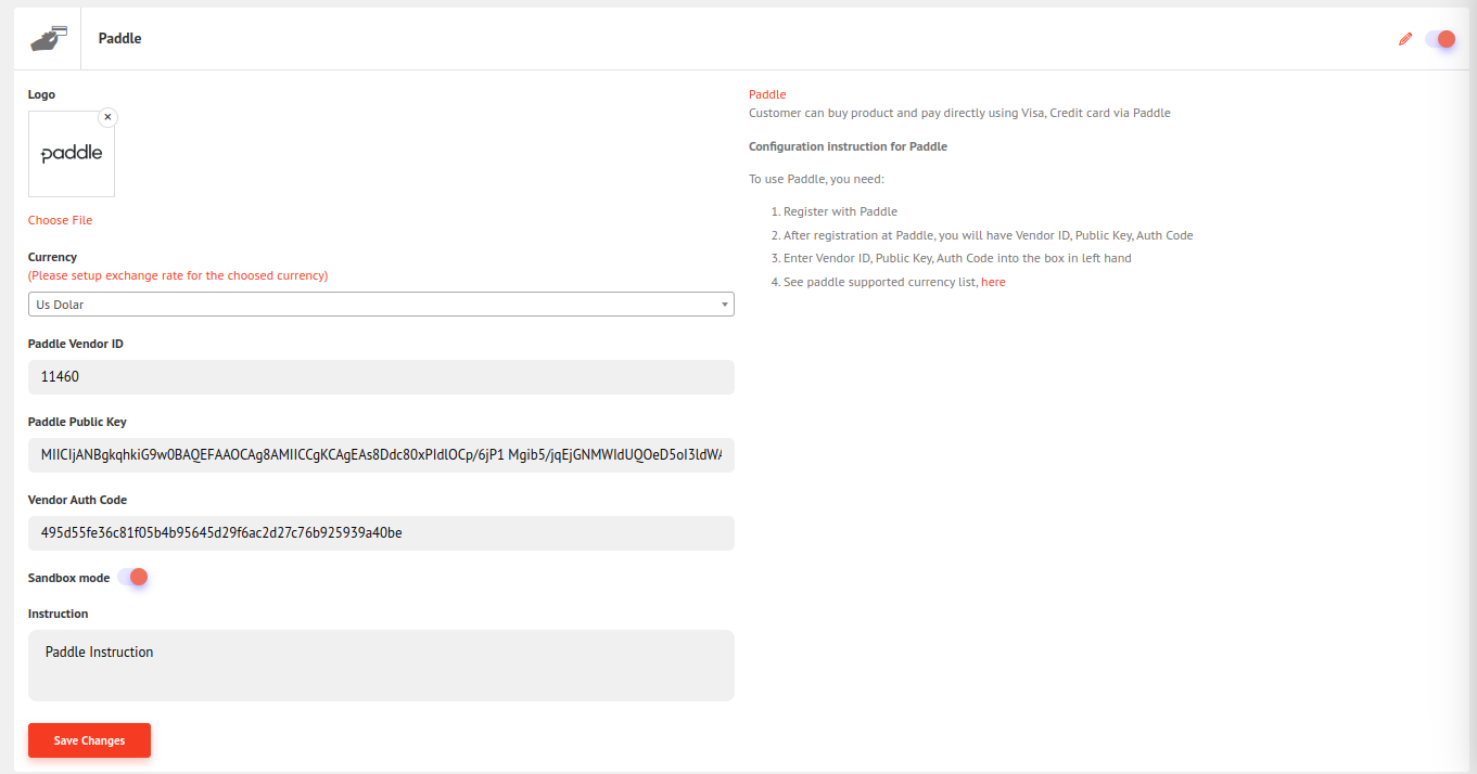For Paddle vendor id, public key, and auth key follow the link https://www.paddle.com/ and register. After registering, you will be given the vendor id, public key, and auth key. Now fill in the field and click save changes. And there is also a sandbox switch for check purposes, you can switch it off for live payment.