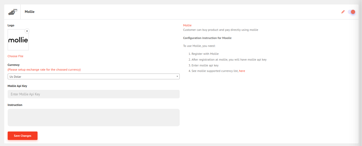 For the Mollie API key follow the link https://my.mollie.com/ and register. After registering, search for the API key inside the developer section. Now fill in the field and click save changes.
