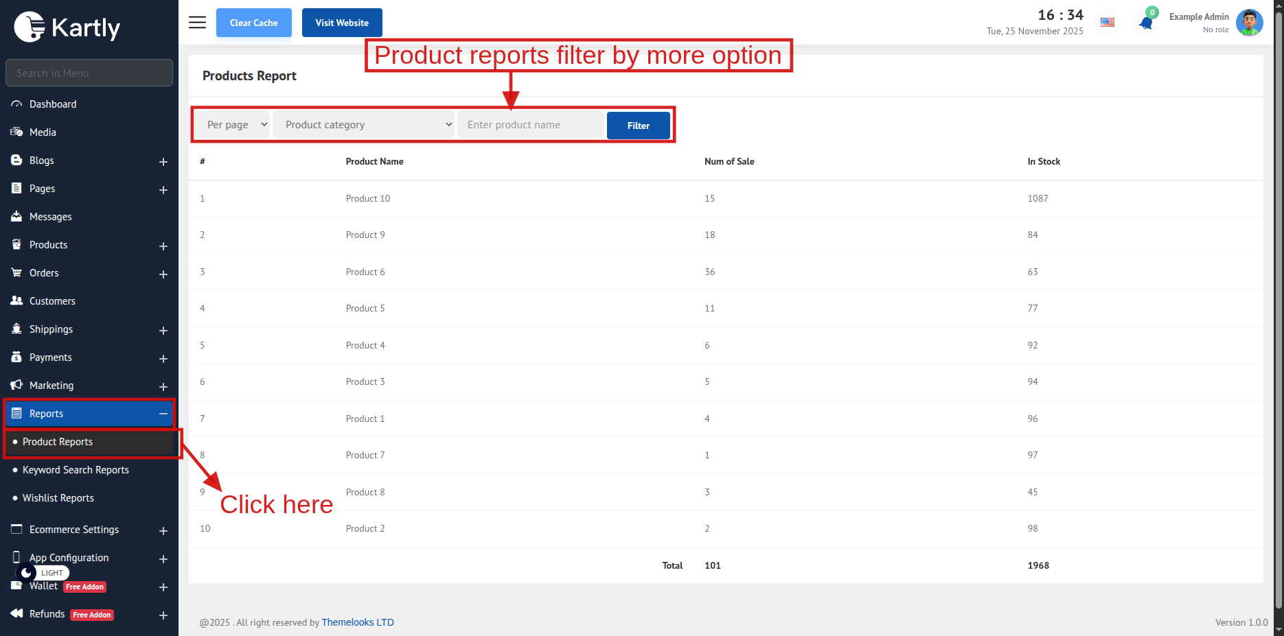 Follow Reports > Product Reports. Here in this list, you can see product sales and in stock reports. You can filter reports by product category, search product name, and per-page report number.