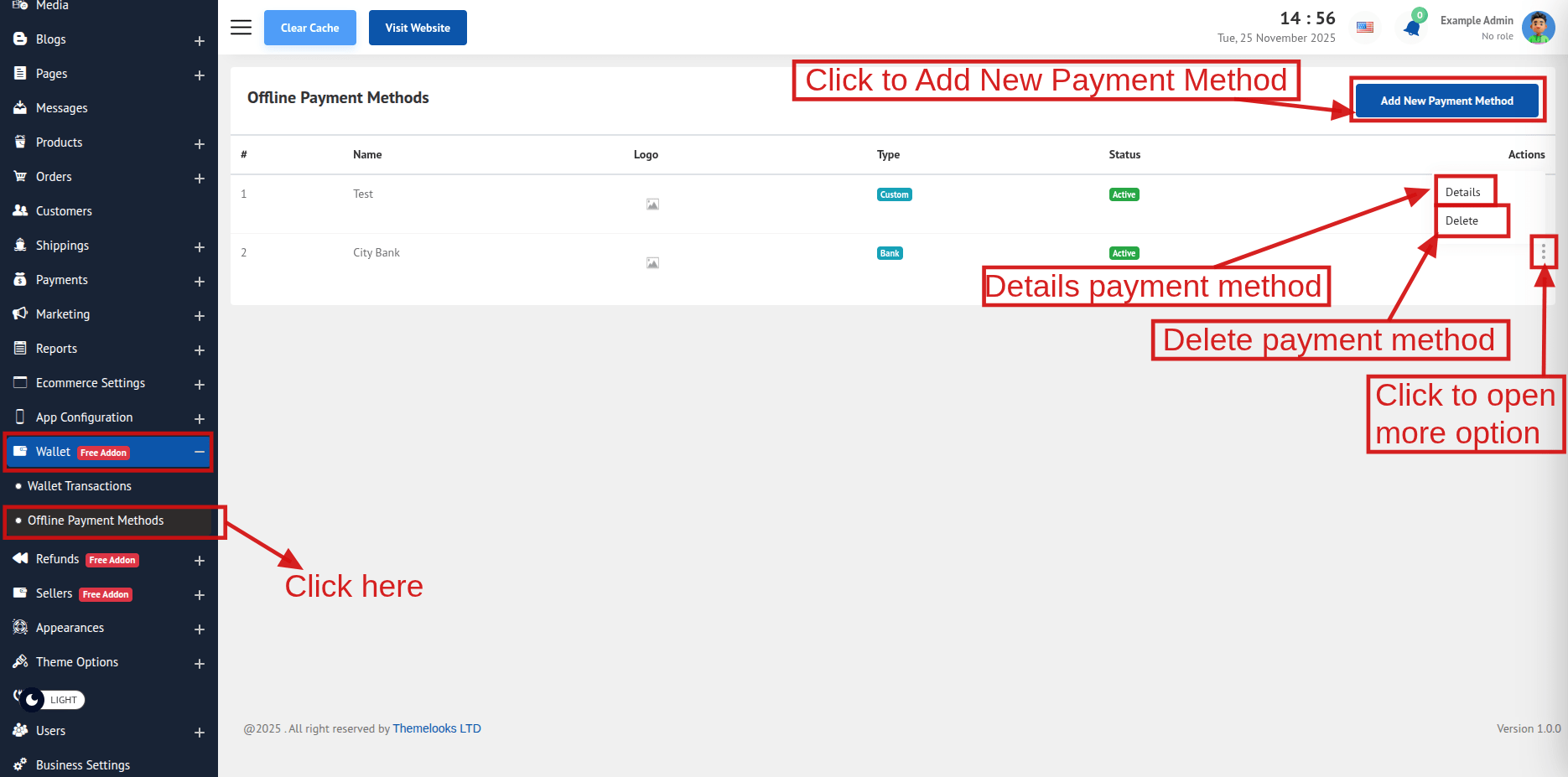 With Wallet Plugin active, you can add Offline Payment methods. Offline Payment methods are used so that customers can add amounts to their wallets other than online payment methods.
