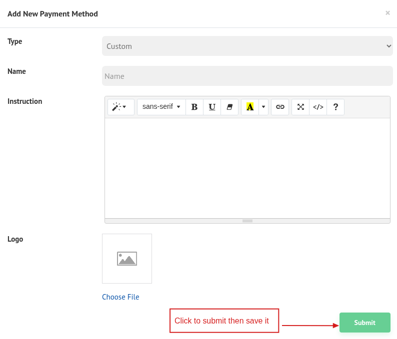 Then after filling in all fields, click Submit to save the method. Don't forget to fill out instructions about these methods.