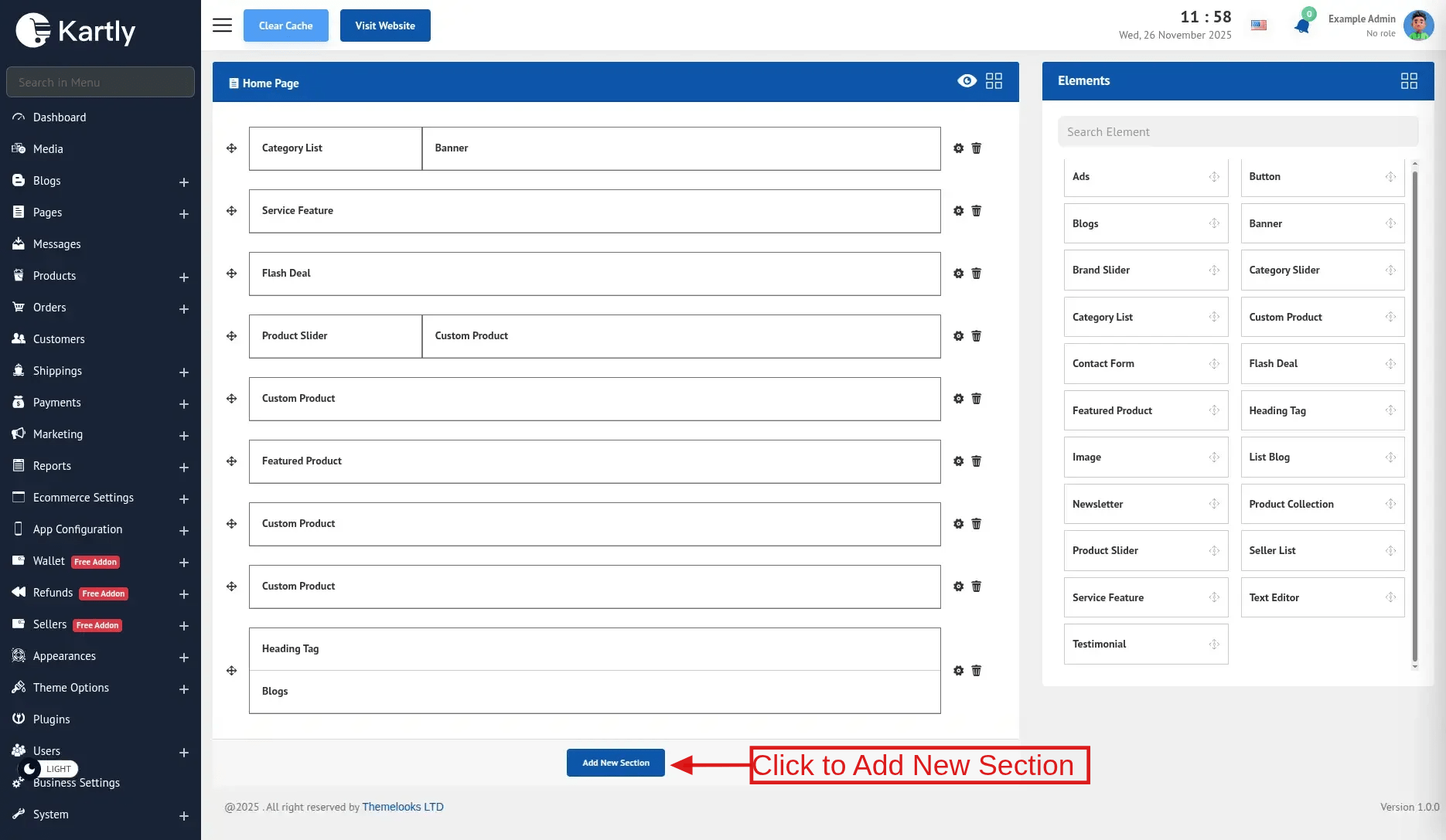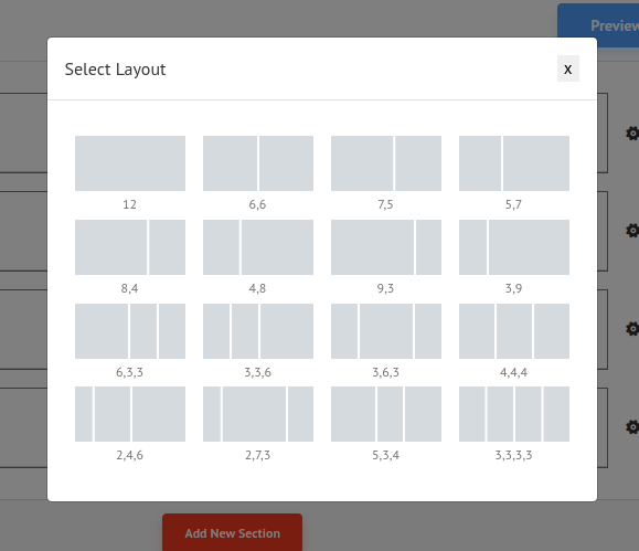 Click Add New Section and you will get a popup to select which section layout you want.