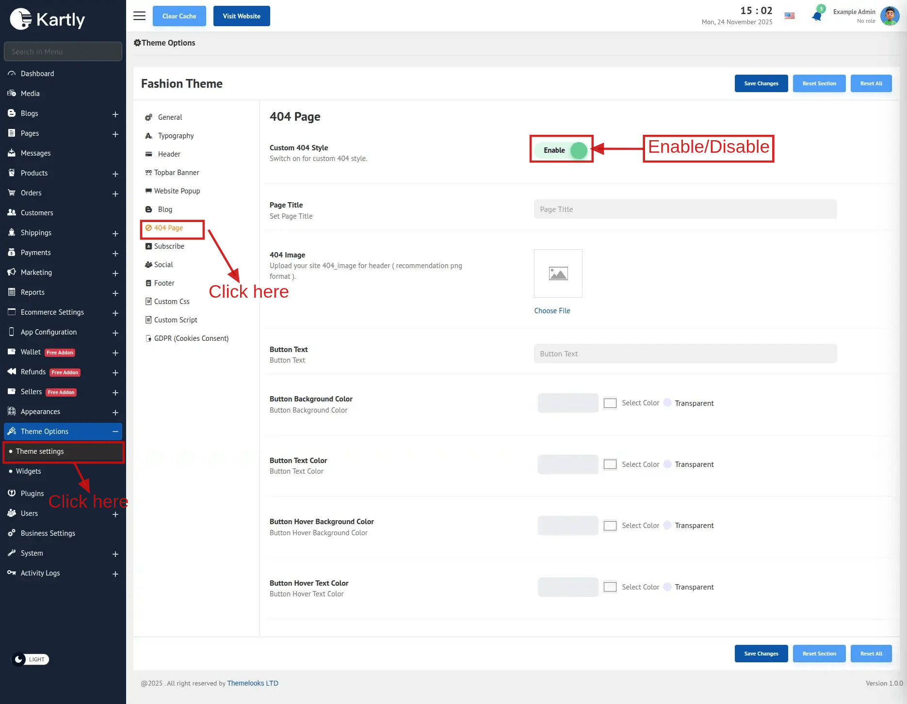 You can customize the 404 Page as you like. Follow Theme Options > Theme Settings. Here click 404 Page, and the 404-page field will appear.