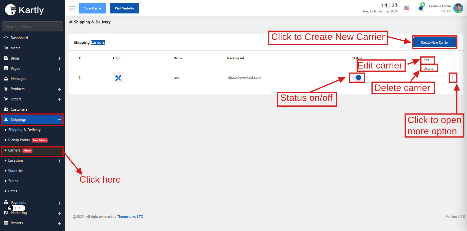 To edit a carrier click Edit from carrier list. It will open a model. Here you can make changes and update carriers. To delete a carrier click Delete from the carrier list.
