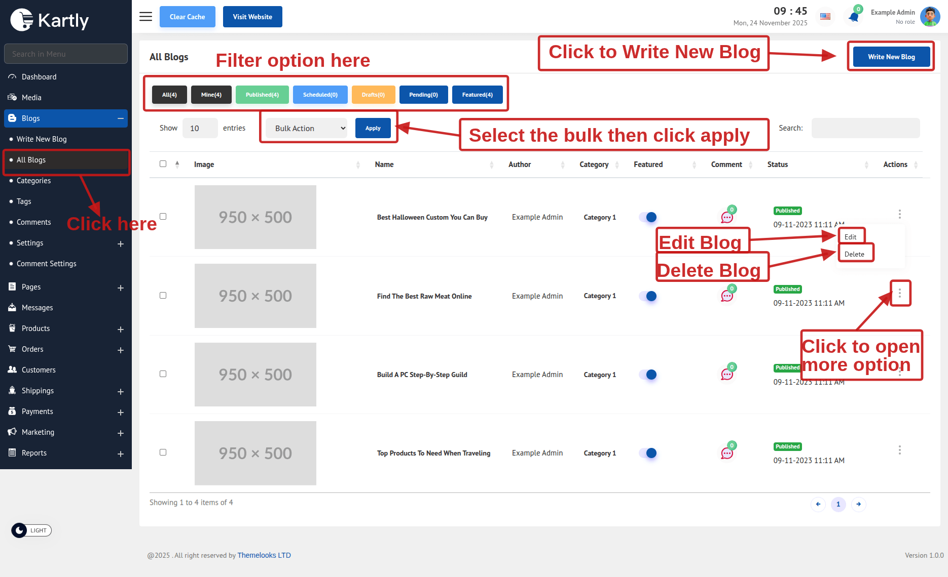 Follow Blogs > All Blogs to see the blog list page. Here you can filter blogs, manage status, edit blogs, delete blogs, and also can create blogs.