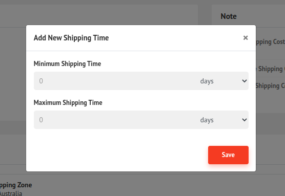 To Create New Shipping Time click on Create New Time. It will open a model. Here you can set minimum and maximum time and click Save.