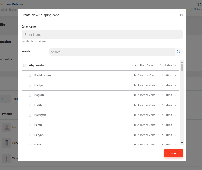 To create a new shipping zone you need to click Create Shipping Zone button. A Create New Shipping Zone popup is open after clicking the Create Shipping Zone button.
