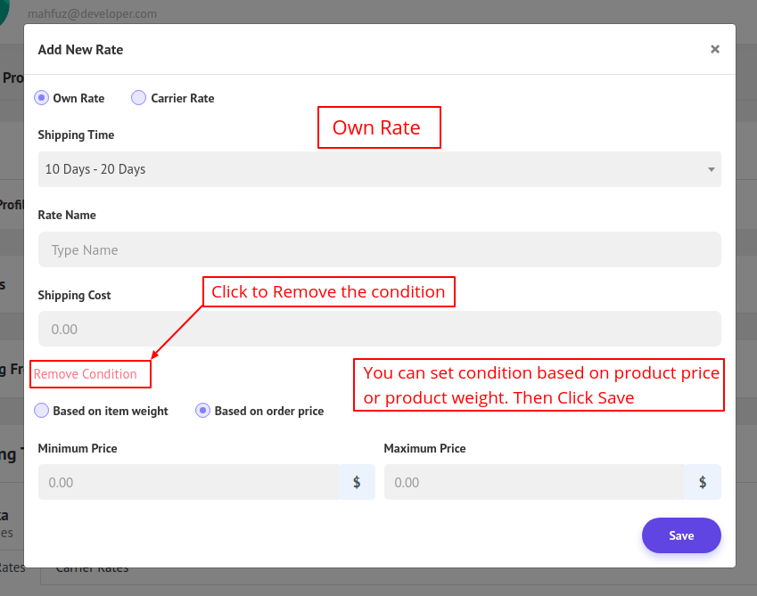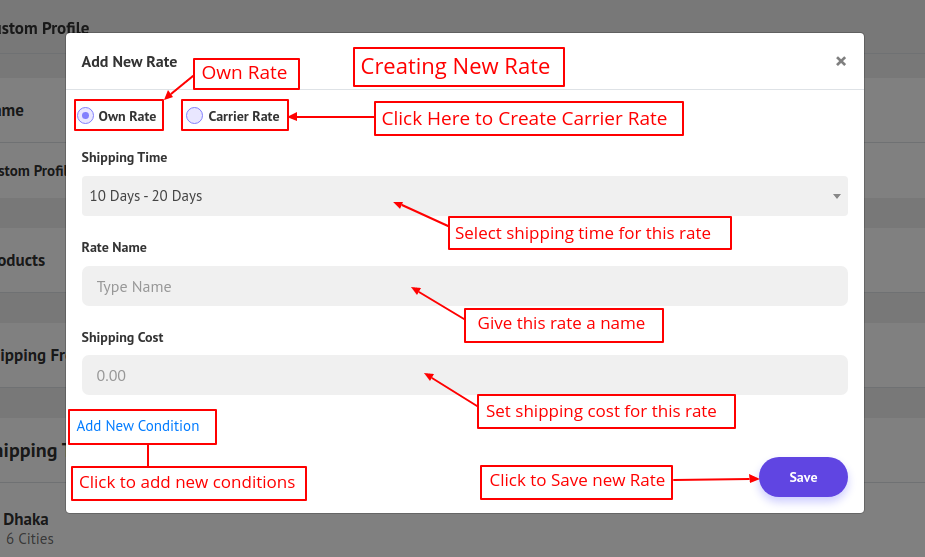 To create your own rate select your own rate radio on top. And If you want you can add a condition by clicking Add New Condition.
