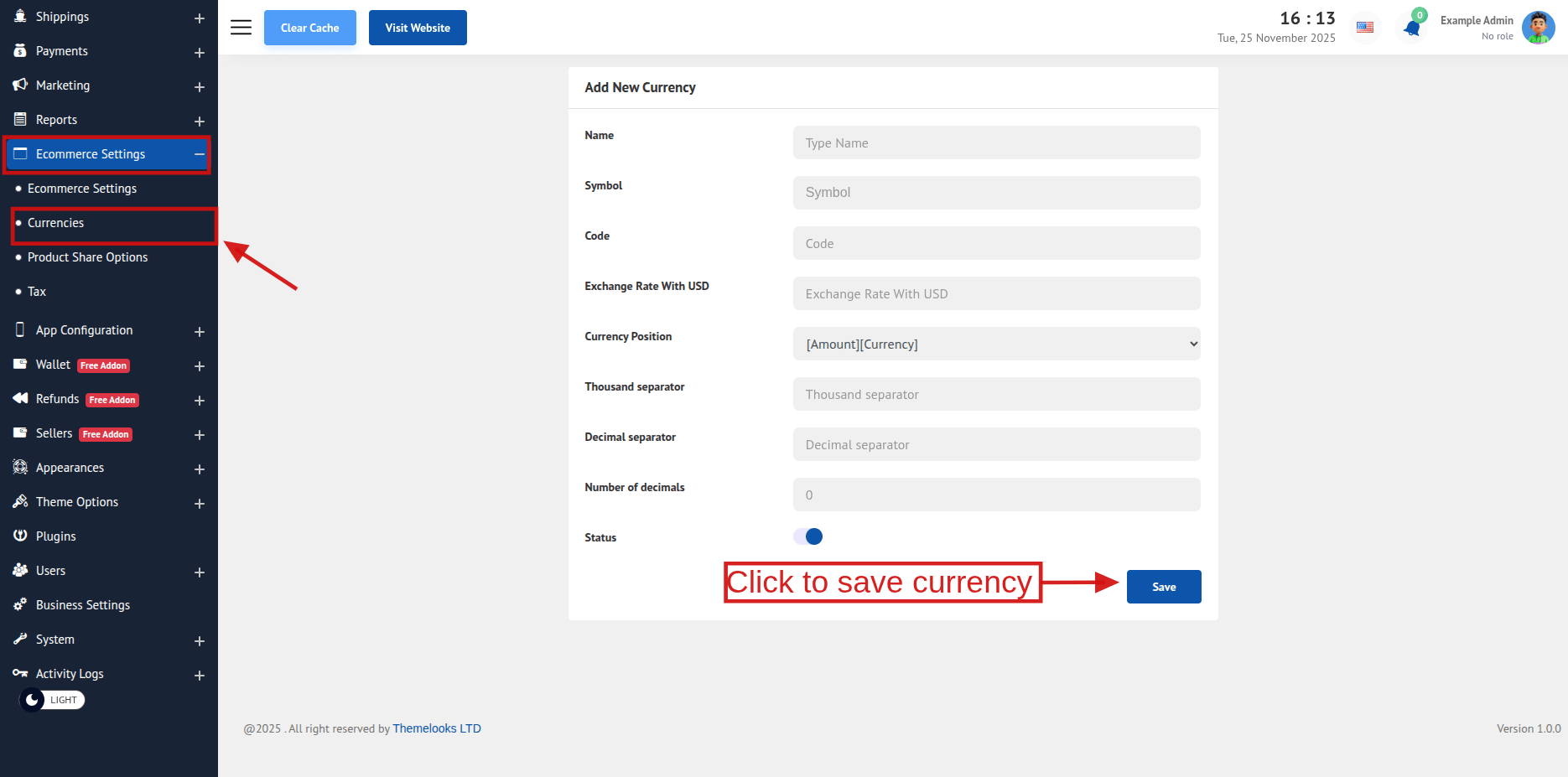 Currency is one of the most important parts of our e-commerce system. You can create as many currencies as you want and can manage them by status on/off.
