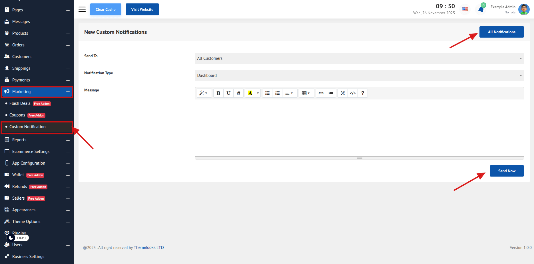 In this post, we will learn how to manage Custom Notifications. Follow Marketing > Custom notification and you will be redirected to the custom notification page. Where you can find all the notifications sent manually.