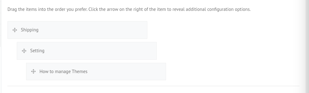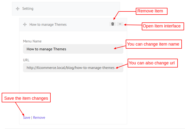 - You can manage each item by clicking on the + icon. you can also remove items from the menu.
