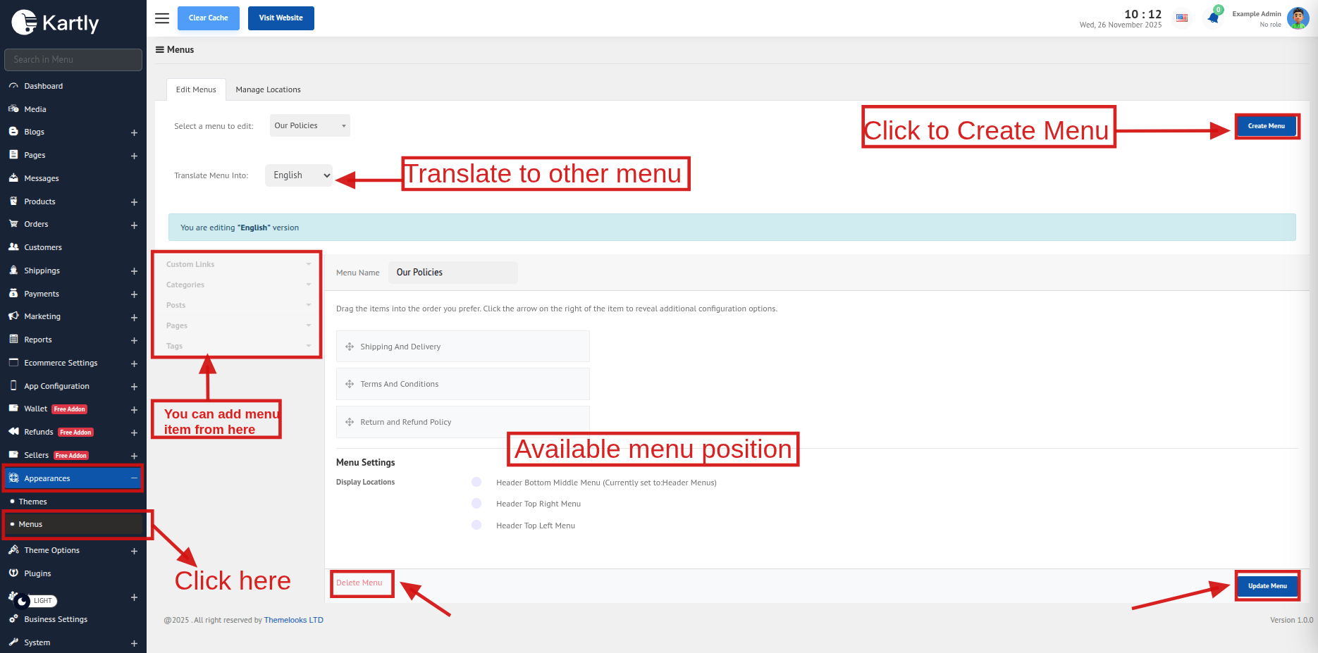 - You can delete a menu by clicking Delete Menu Button. You can assign a menu to the three header location and save it.