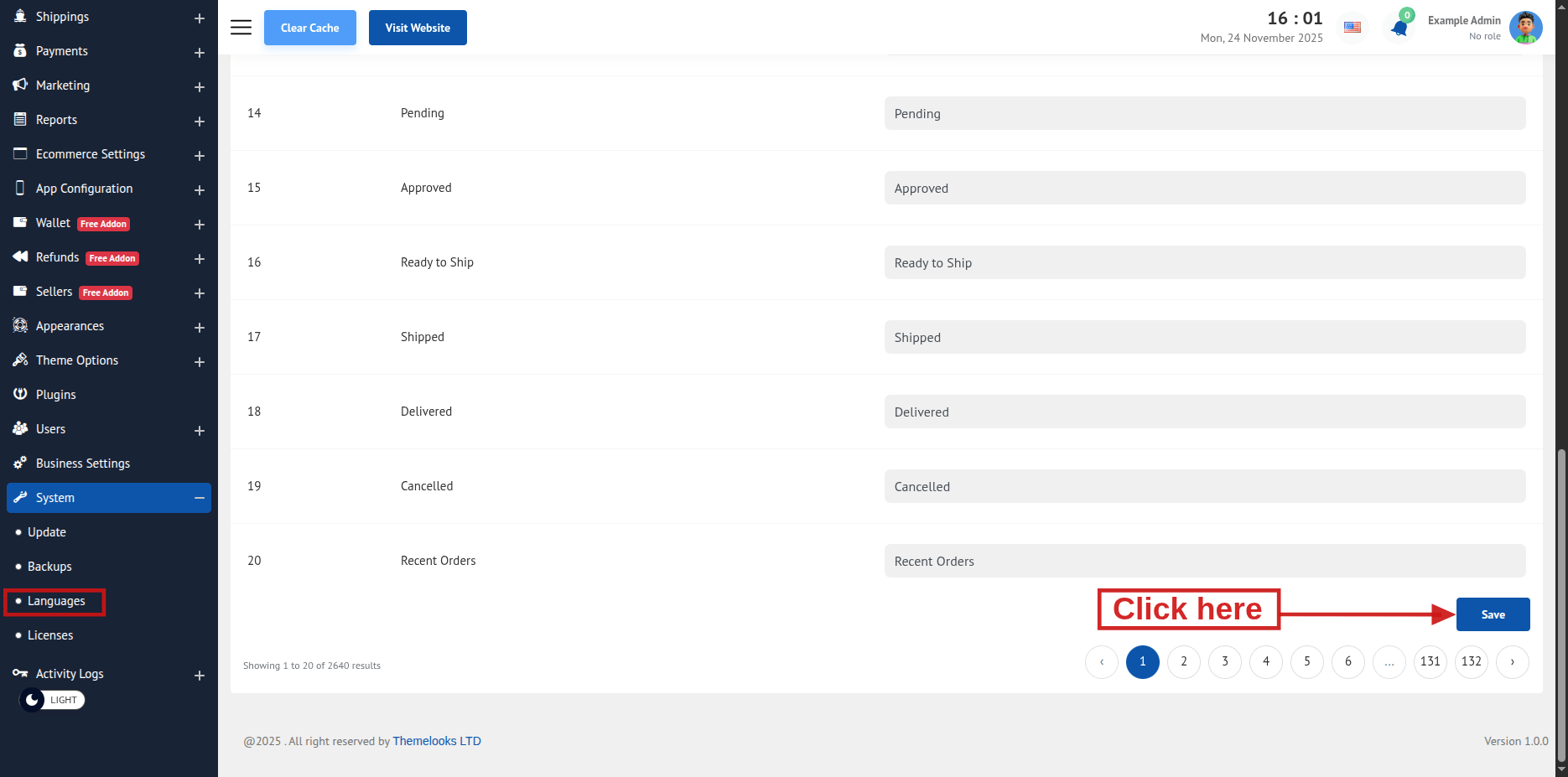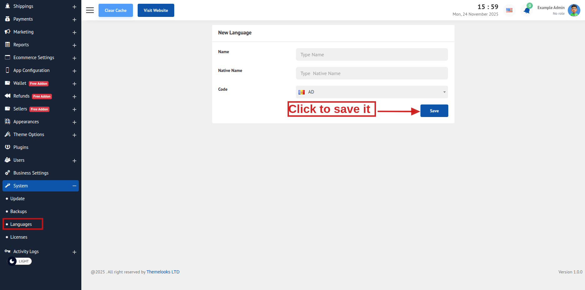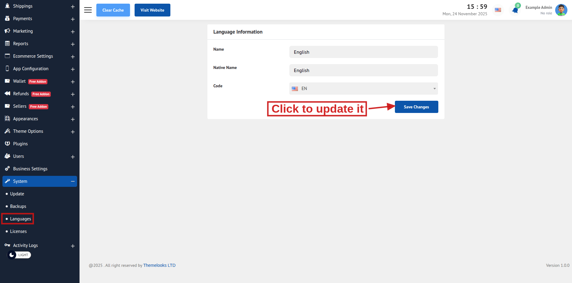 To Edit a Language Click The Edit from the language list Action options. It will redirect you to edit page.
