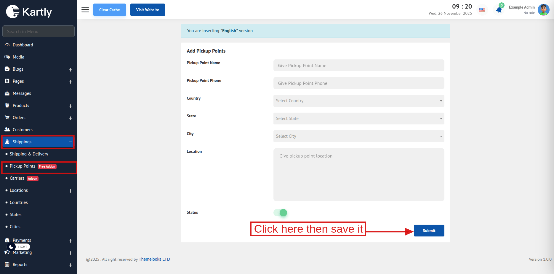 Here you can create a new pickup point. You can set the Pickup point name, Pickup point phone, Country, State, City, Location, and status.