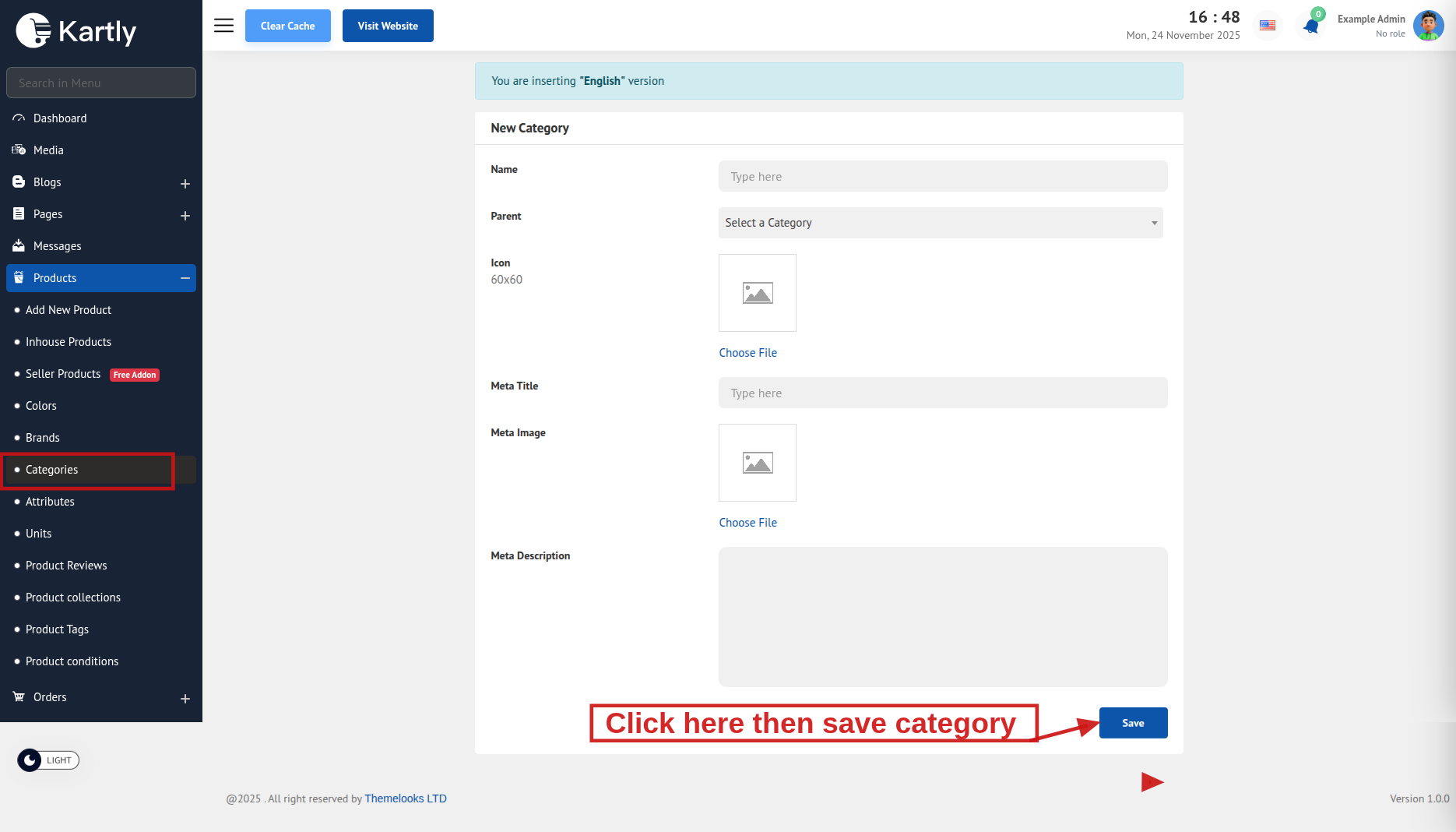 You can save the name, edit the permalink, select parent if needed, and also select the icon. You can also set some SEO information. Then click Save.
