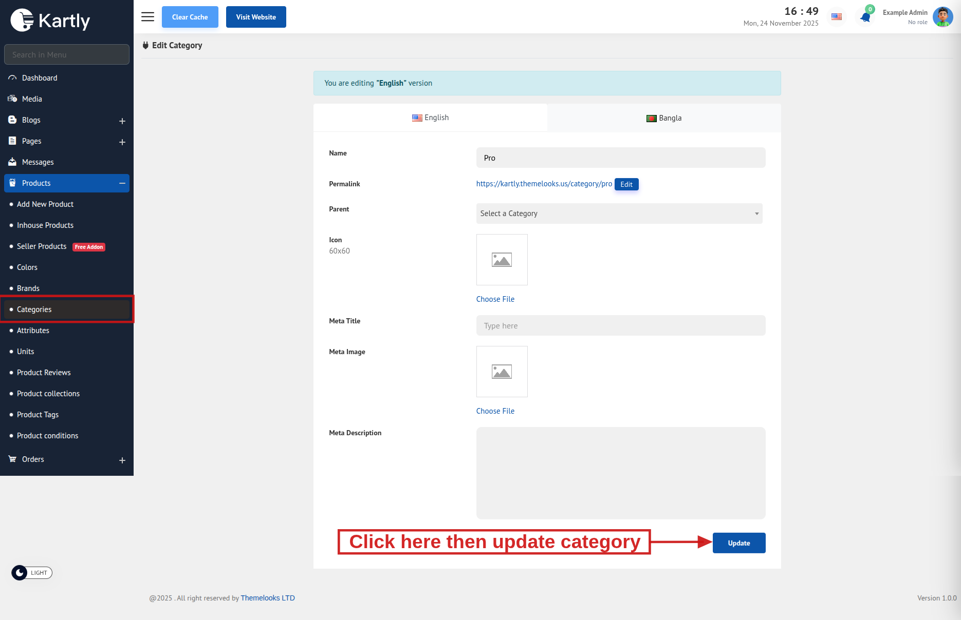 If you want to Edit a category click the Edit link from the list page action column three dot. It will redirect you to another page. You can also delete a category by clicking Delete Link.
