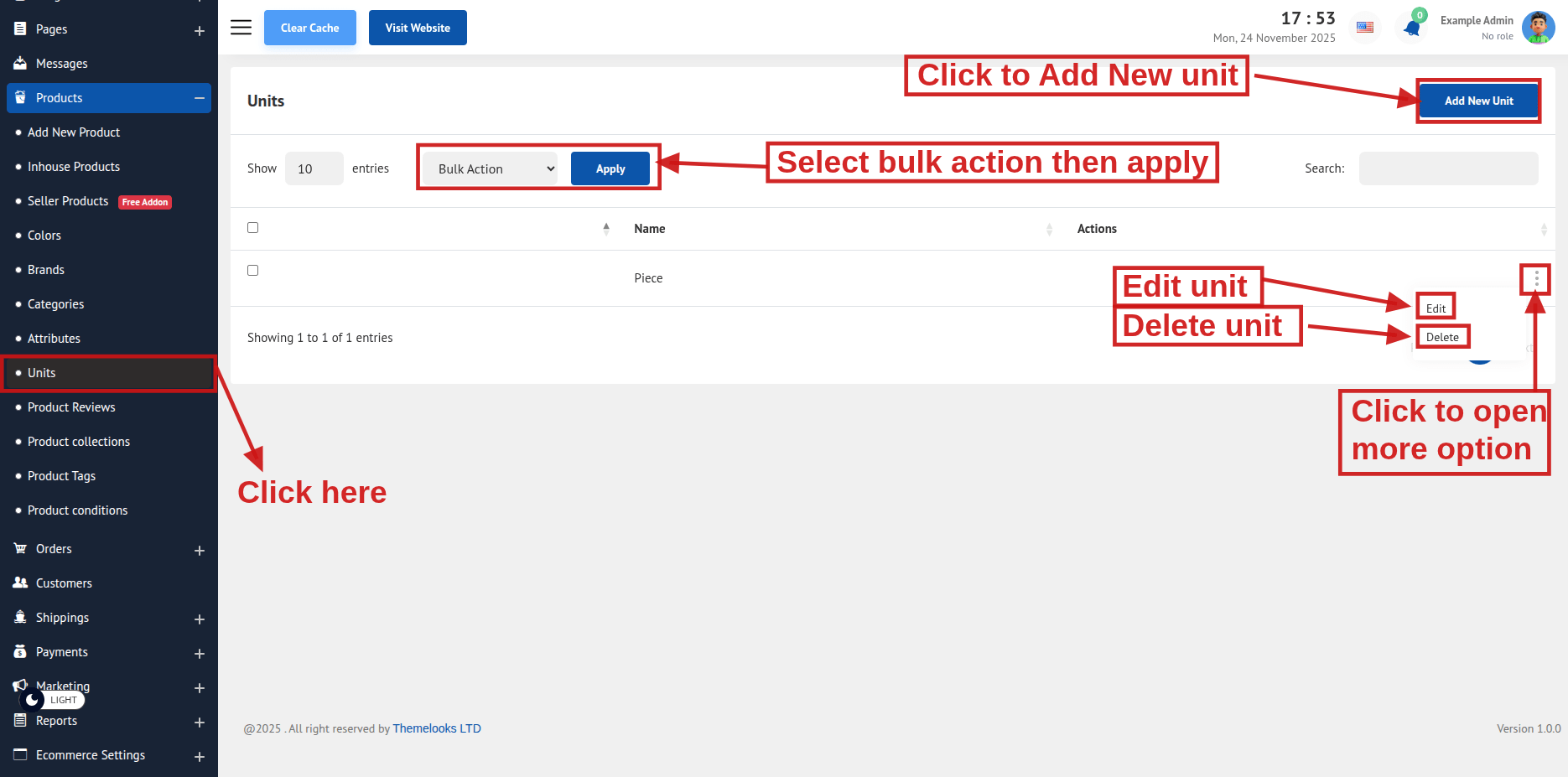 If you want to update a unit click Edit from unit list page and it will redirect you to edit page. You can also delete a units by clicking Delete Link.