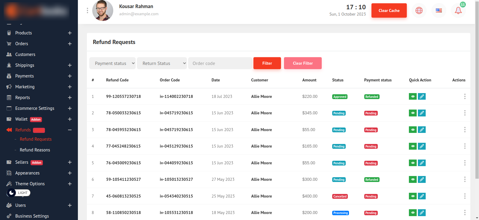 As you can see all the refund requests are here, and you can filter them by payment status, return status, or order code.