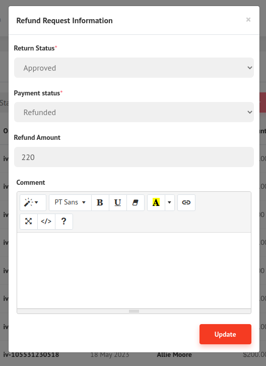 - You can update the refund status with Quick Update Icon. A modal will appear and you can update them.