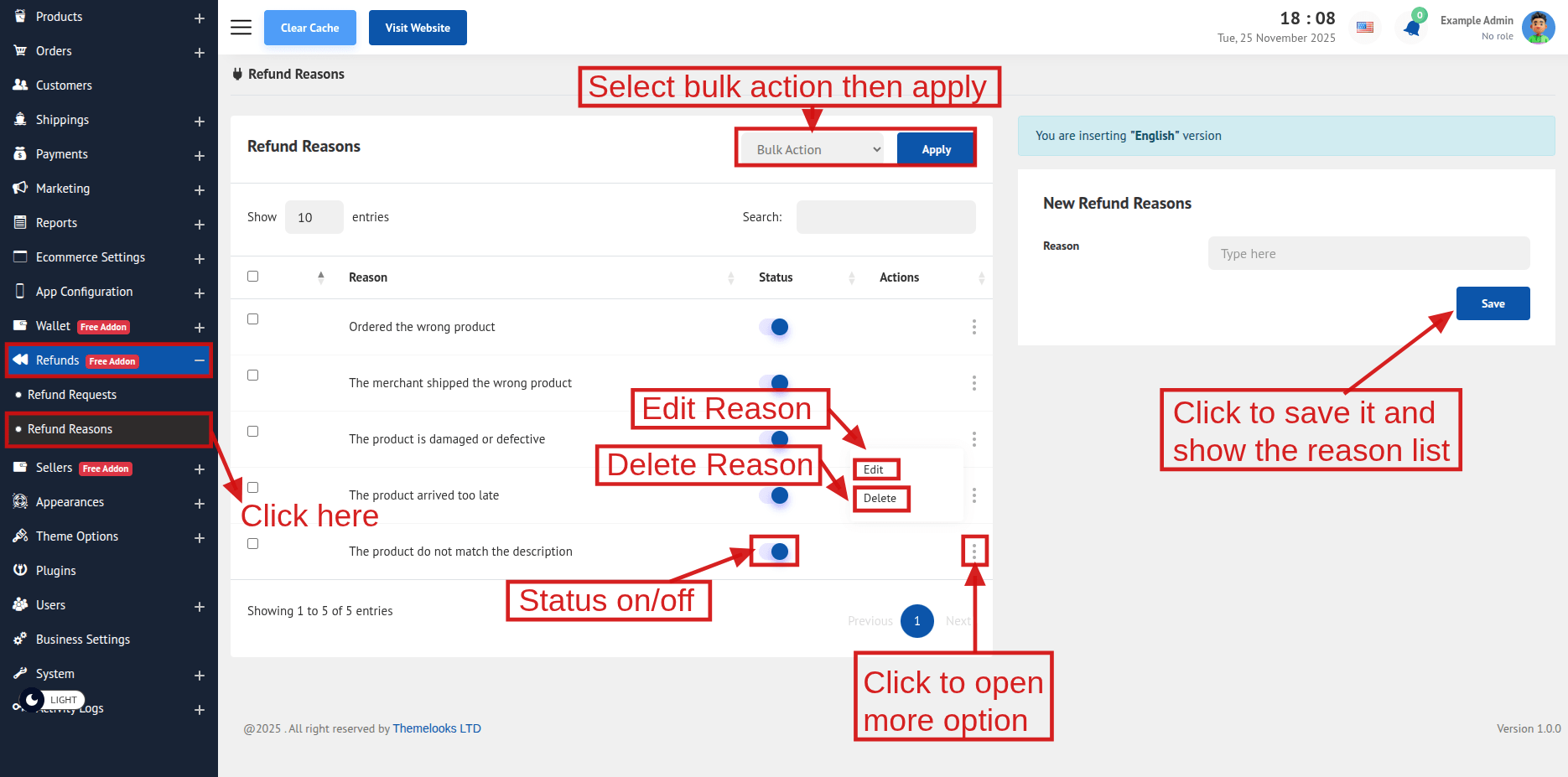 Here you can create new Refund Reasons. When customers want to return a product they must select from these reasons why they want to return it. So you can create all the reasons from here. You can also delete reasons and also can update them.